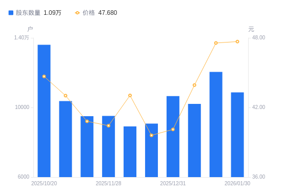 2月5日消息,数据显示,截至2026年1月30日,富特科技A股股东总户数为1.09万户,较上期(2026年1月20日)减少1177户,降幅9.77%。公司最新A股总股本为1.55亿股,其中流通A股1.12亿股,户均持有流通A股数量为1.03万股,较上期增加1005.63股,增幅10.83%;户均持流通A股市值49.07万元,较上期增加4.91万元,增幅11.11%。