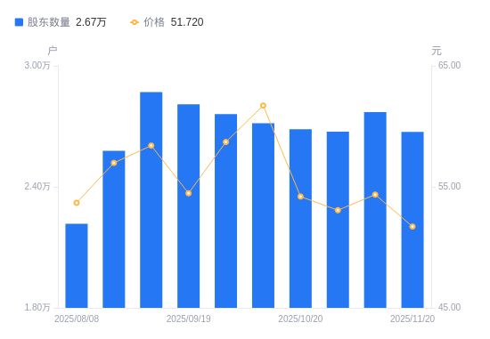 近一年(2024年11月20日至2025年11月20日),珂玛科技A股股东户数从3.22万户,减低至2.67万户,降幅16.99%,区间股价下跌16.67%。