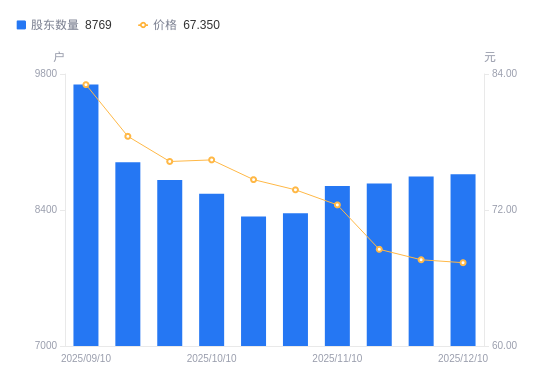 12月11日消息,数据显示,截至2025年12月10日,港迪技术A股股东总户数为8769户,较上期(2025年11月28日)增加24户,增幅0.27%。公司最新A股总股本为5568万股,其中流通A股2551.06万股,户均持有流通A股数量为2909.18股,较上期减少7.98股,降幅0.27%;户均持流通A股市值19.59万元,较上期减少1296.19元,降幅0.66%。