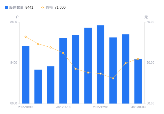 1月12日消息,数据显示,截至2026年1月9日,港迪技术A股股东总户数为8441户,较上期(2025年12月31日)减少239户,降幅2.75%。公司最新A股总股本为5568万股,其中流通A股2551.06万股,户均持有流通A股数量为3022.23股,较上期增加83.22股,增幅2.83%;户均持流通A股市值21.46万元,较上期增加9082.45元,增幅4.42%。