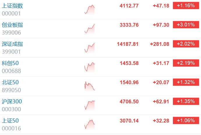 格隆汇2月9日|A股主要指数持续拉升,沪指涨1.16%,创业板指涨3.01%,深证成指涨2.02%。CPO、光伏、影视等板块指数涨幅居前,沪深京三市超4500股上涨。