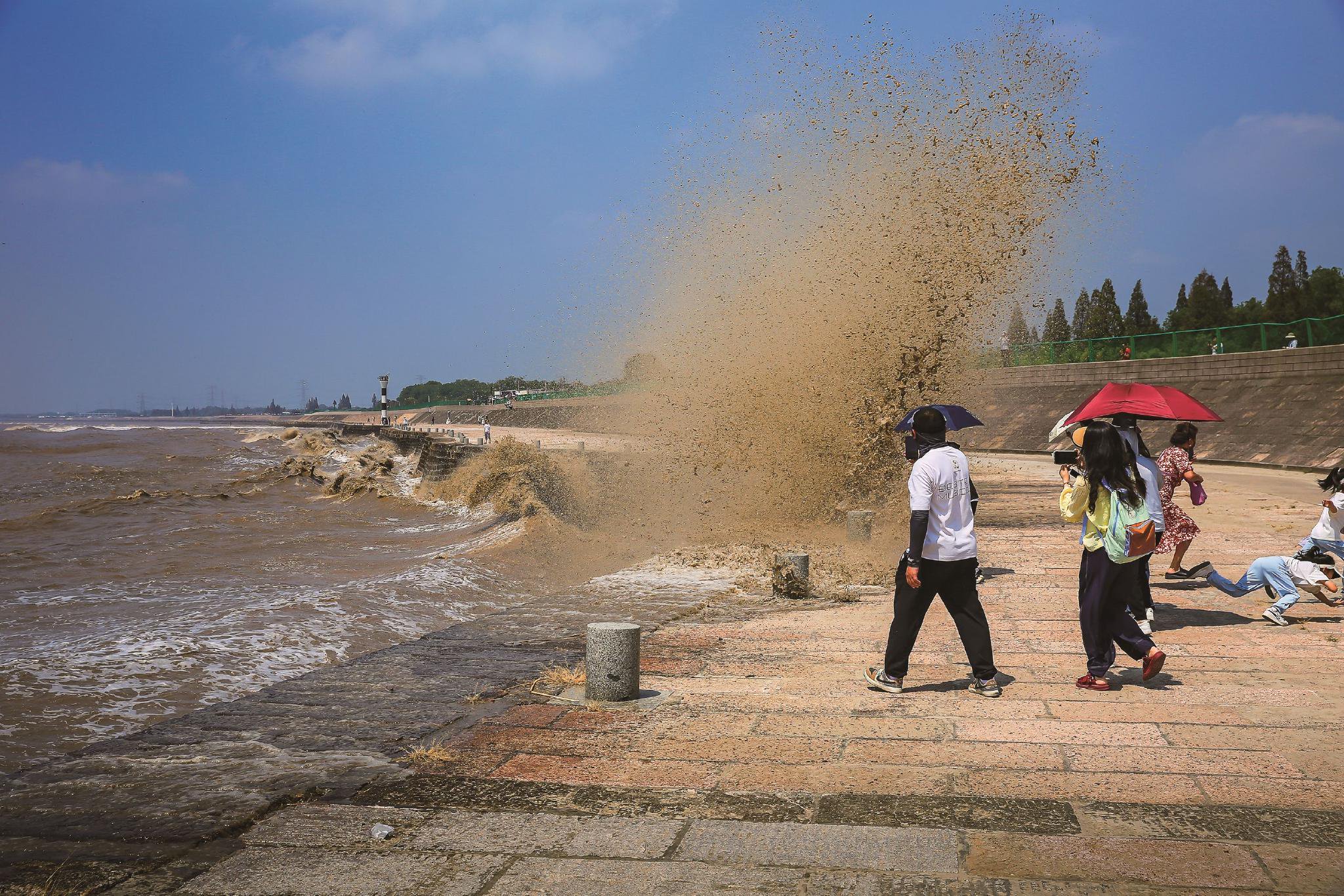 点评:画面定格了潮水拍岸、泥水冲天的震撼瞬间,飞溅的黄褐色水浪形成巨大的“沙幕”,和画面右侧行人躲避、拍摄的反应形成强烈动静对比。右下角人物踉跄躲闪的姿态,让潮水的冲击力具象化,尽显现场惊险与刺激。