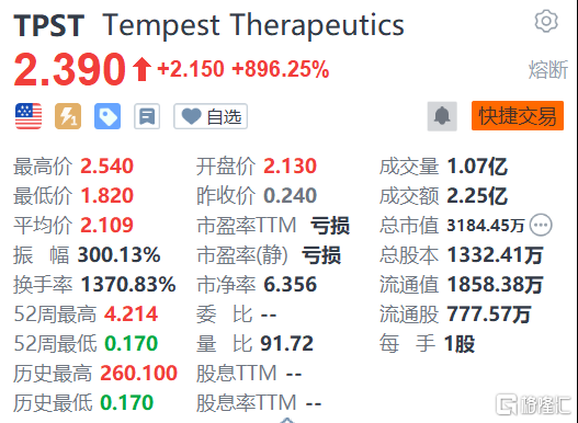 生物技术公司Tempest(TPST.US)狂涨896.25%,报2.39美元。消息面上,Tempest Therapeutics于昨日发布新闻稿,表示将于今日盘前报告TPST-1120 一线肝细胞癌全球随机组合研究的新数据和更新数据,并进行电话会议直播。临床前数据表明,TPST-1120可以直接杀死肿瘤细胞,并缓解免疫抑制,而在广泛的非临床研究中,TPST-1120作为单一疗法或与其他抗癌药物联合使用,可显著减少肿瘤生长并产生持久的抗肿瘤免疫。