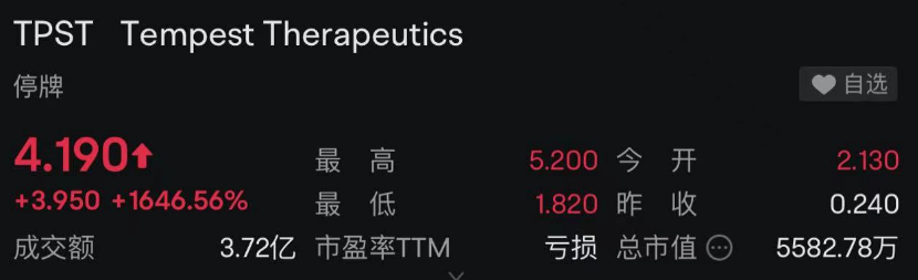 周三(10月11日)美股盘中,生物科技公司Tempest Therapeutics, Inc.股价涨超1600%,报每股4.19美元。