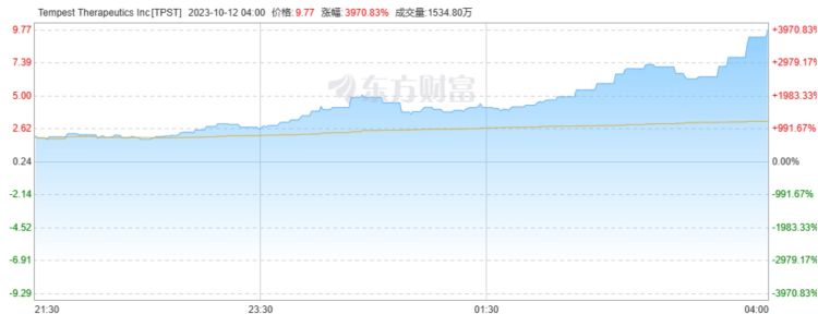 美东时间10月11日,生物科技公司Tempest Therapeutics股价飙涨3970.83%。截至收盘,Tempest(纳斯达克股票代码:TPST)报9.77美元/股。