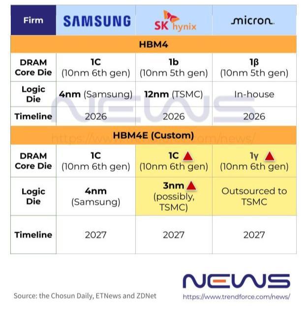 一位半导体行业内部人士表示:“对于定制化 HBM4E,逻辑芯片是根据客户规格制造的,因此 3nm 和 12nm 等工艺都在考虑之中。但预计 3nm 工艺将是供应给市场的大部分 HBM4E 逻辑芯片的主要选择。”