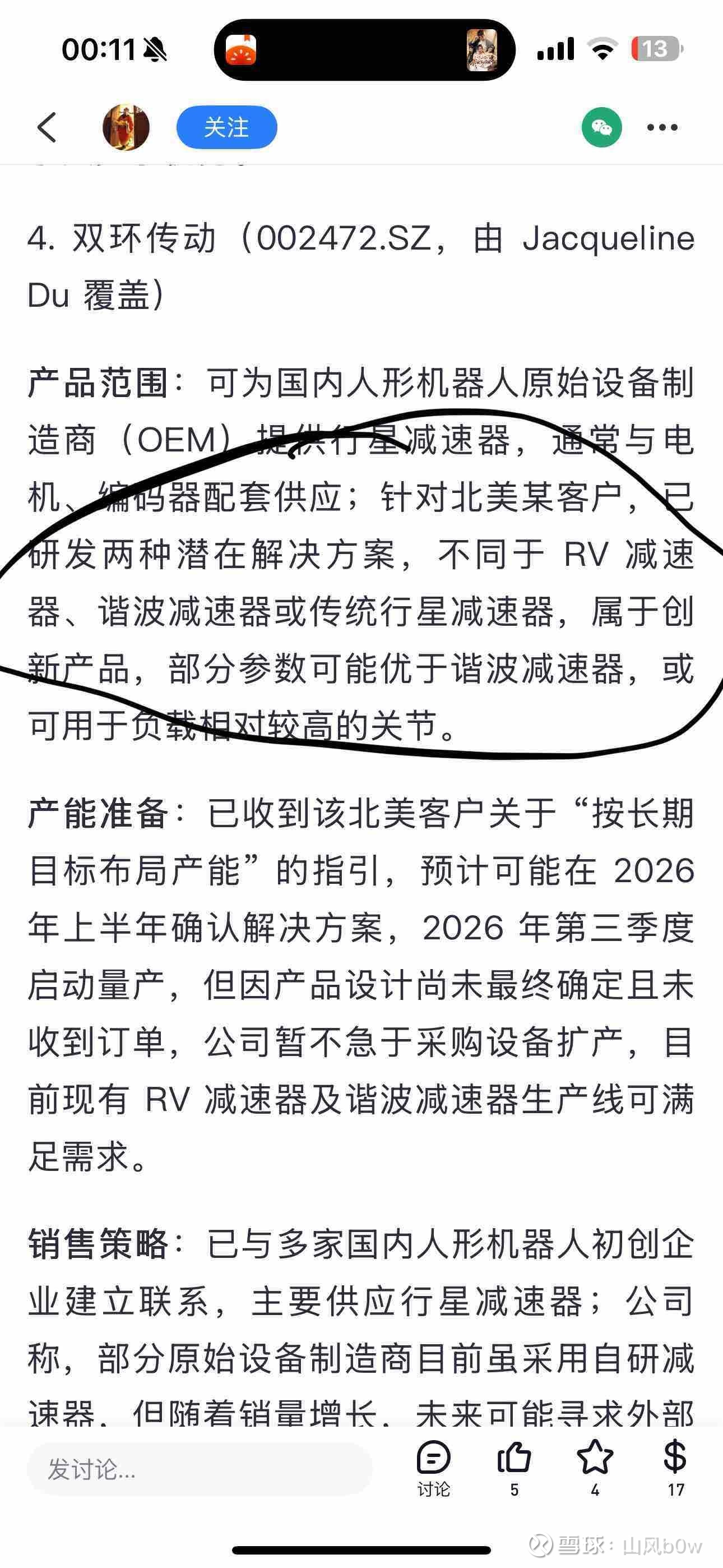 : 双环的RV在人形方面几乎无应用,重点在工业机器人,埃斯顿,埃夫特,卡普诺等,人形同RV太奢侈了,现在人形的标准还没拍板,没那么快//