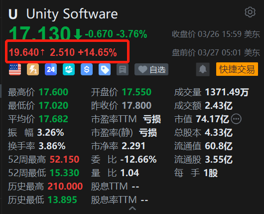 Unity Software(U.US)盘前涨14.65%报19.64美元。消息上,根据2026年3月27日公布的最新数据,Unity在26年第一季度的财务表现强劲。营收超预期:预计营收为5.05亿至5.08亿美元,高于此前4.8亿至4.9亿美元的业绩指引。盈利能力提升:调整后的EBITDA(税息折旧及摊销前利润)预计为 1.3亿至1.35亿美元,远超此前1.05亿至1.1亿美元的指引,同比增长约58%。