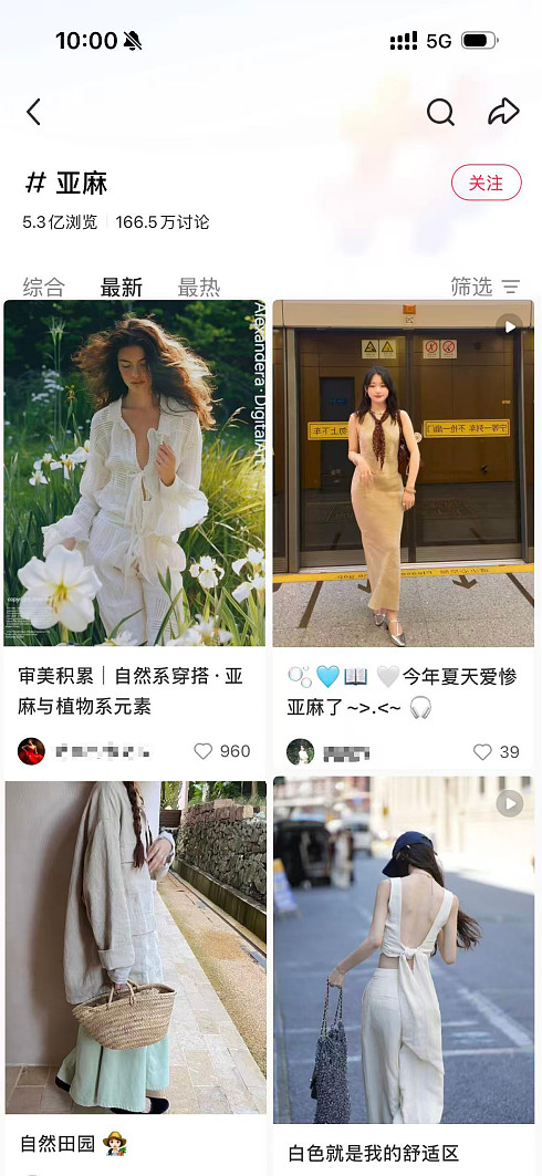 从街边小店到时尚品牌的橱窗,亚麻正以一种前所未有的强势姿态,拿捏了年轻人小情绪。它跳过“妈妈辈的茶歇裙”或“文艺青年的标签”,直接晋升为今年的“顶流”,小红书上,亚麻相关话题浏览量达5.3亿,而以女性用户为核心的电商平台唯品会数据显示,女生们比以往更青睐亚麻,今年夏天,亚麻服饰的销量是去年同期的3倍。