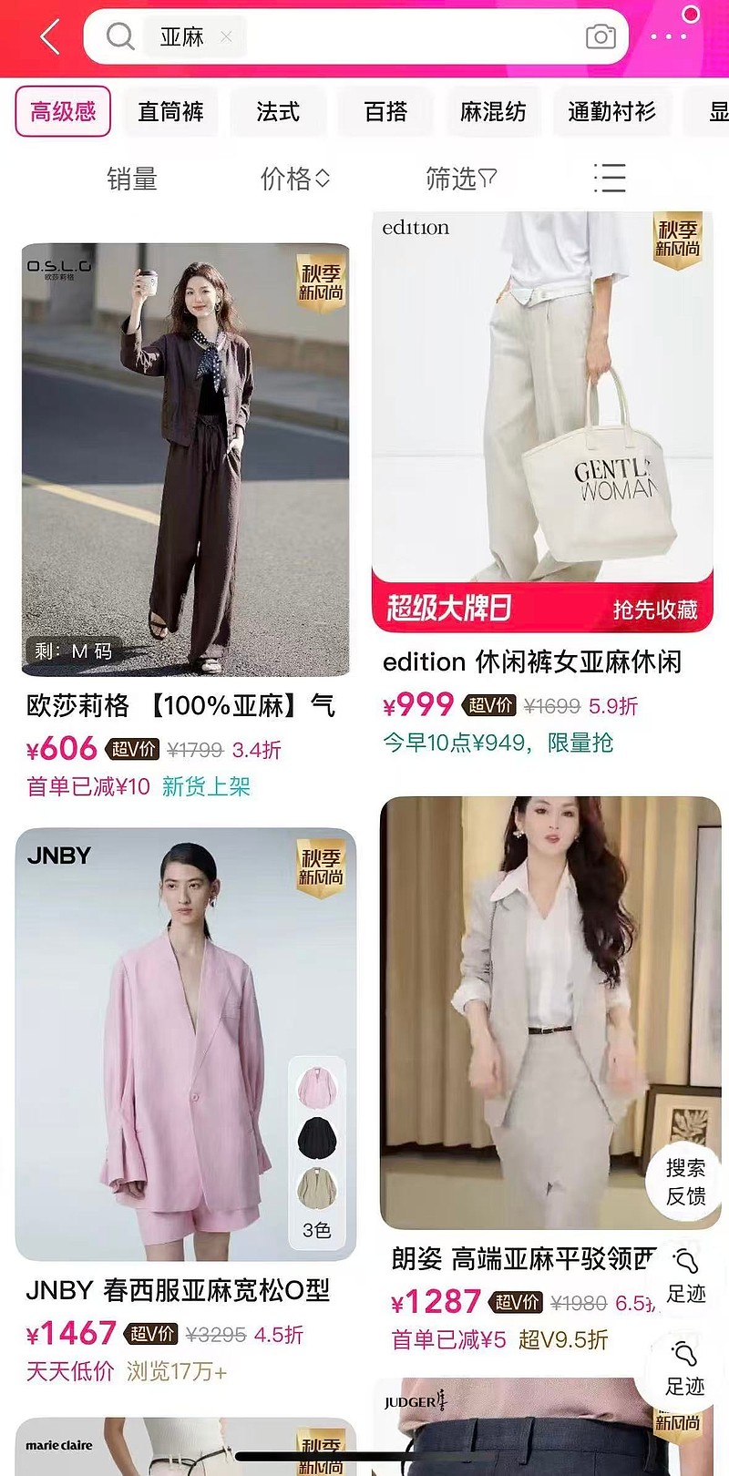 事实上,多家电商平台都预测,亚麻的流行度可能会进一步提升。据《2025唯品会服饰行业秋冬趋势白皮书》预测,2025秋冬八大风格趋势之首就是以“Old Money”为关键词的静奢优雅风,其核心强调面料和设计,推崇不露声色的贵气和低调内敛的质感。亚麻,这种有着数千年使用历史、自带天然肌理和柔和光泽的面料,完美契合了“老钱”们对传承、质感和“不刻意炫耀”的想象。