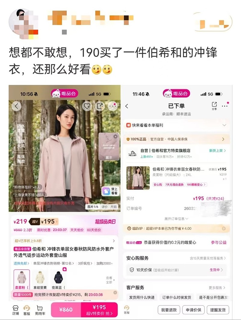 直到上周,偶然在网上刷到有人分享,说在唯品会买到了190多元的伯希和单层冲锋衣,性价比拉满,品质也很靠谱。我心里一动,伯希和也是户外老牌子了,既然有人实测好用,正好可以试试。