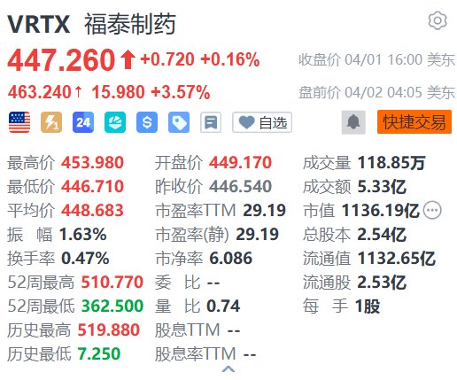 福泰制药(VRTX.US)盘前涨3.57%,报463.24美元。消息面上,福泰制药周三表示,美国食品药品监督管理局已批准Alyftrek和Trikafta的标签扩展,用于治疗囊性纤维化患者。更新后的标签现在包括具有任何导致CFTR蛋白生成的CFTR基因变异的患者,这是基于临床和体外数据得出的。此外,富国集团分析师Mohit Bansal维持福泰制药“买入”评级,目标价从515美元上调至550美元。