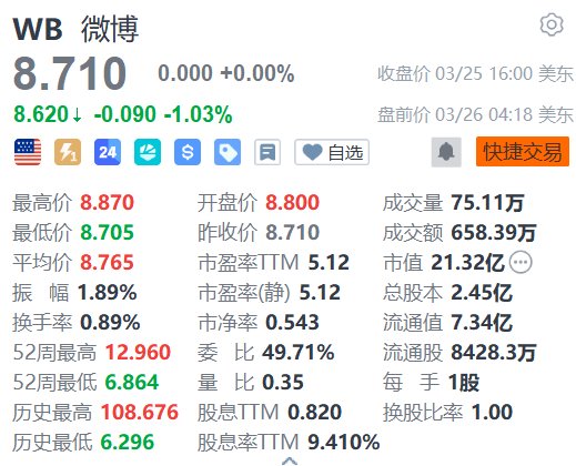 微博(WB.US)盘前跌1.03%,报8.62美元。消息面上,微博绩后遭多家大行下调目标价。其中,野村发研报指,微博2025年第四季收入按年增长4%至4.73亿美元,较市场及该行预期分别高出7%及5%。非通用会计准则经营利润按年下跌26%至1亿美元,利润率按年收窄8.6个百分点至21.2%,低于该行预期,主要由于毛利率逊预期,加上市场推广开支及产品开发开支高于预期。该行上调微博今明两年收入预测各7%,但下调每股盈利预测11%及23%,以反映AI相关投资导致经营开支上升,维持“中性”评级,微博美股目标价由11美元下调至9.7美元。
