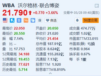 连锁药店沃尔格林博姿联盟(WBA.US)涨3.66%,报21.79美元。消息面上,沃尔格林博姿联盟公布2024财年第二季度业绩,销售额同比增长6.3%,至371亿美元;每股收益同比增长3.4%,至1.20美元,高于分析师预期的82美分。该公司将2024财年每股收益预期从3.20-3.50美元下调至3.20-3.35美元,分析师预期为3.24美元。