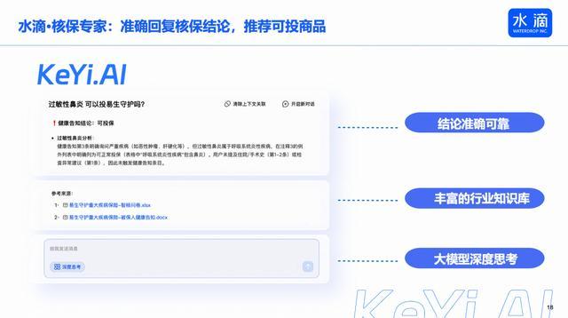 “KEYI.AI”核心在于“专业知识库+大模型推理能力”的深度融合,覆盖上千款当期及历史热卖保险产品条款,整合千万级核保案例与医疗数据,可自动解析用户健康信息,如体检报告中的结节描述、慢性病病史,并与保险条款中的健康告知要求精准匹配。例如,用户咨询“过敏性鼻炎能否投保某重疾险”时,系统可快速定位条款中“呼吸系统炎性疾病的例外约定”,结合用户住院史、手术史等补充信息,10秒内给出“可投保”结论,并标注参考条款来源,解决传统审核中“结论模糊、依据不明”的问题。
