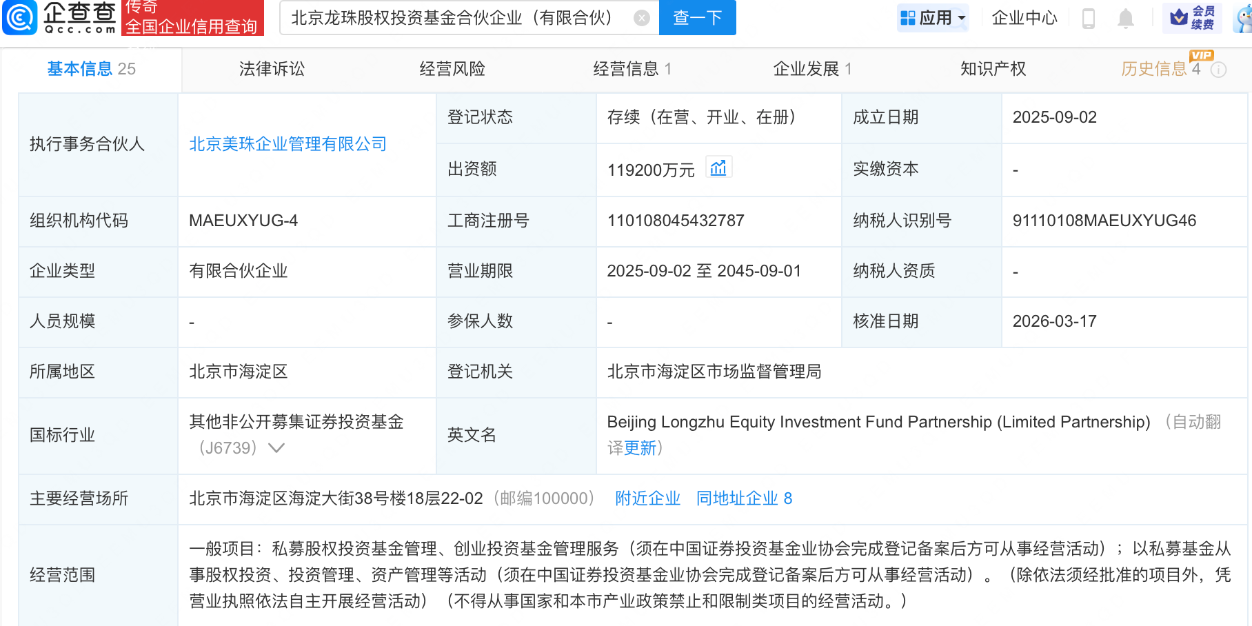 企查查APP显示,近日,北京龙珠股权投资基金合伙企业(有限合伙)发生工商变更,新增北京水滴科技集团有限公司等为合伙人。企查查信息显示,该企业成立于2025年,出资额11.92亿元,经营范围包含:私募股权投资基金管理、创业投资基金管理服务等。