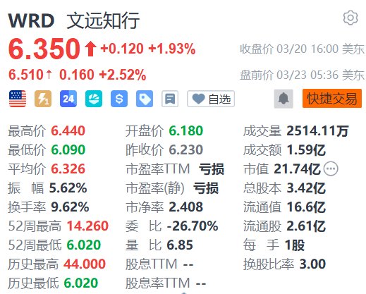 格隆汇3月23日|上周五(3月20日)收涨近2%的文远知行(WRD.US)今日美股盘前续涨2.52%,报6.51美元。消息面上,文远知行将于美东时间3月23日(即今日)盘前发布财报。此外有消息称,文远知行在英伟达GTC 2026大会上展示了基于NVIDIA DRIVE Hyperion平台的Robotaxi GXR,加速其在东南亚及其他地区的扩张。(格隆汇)
