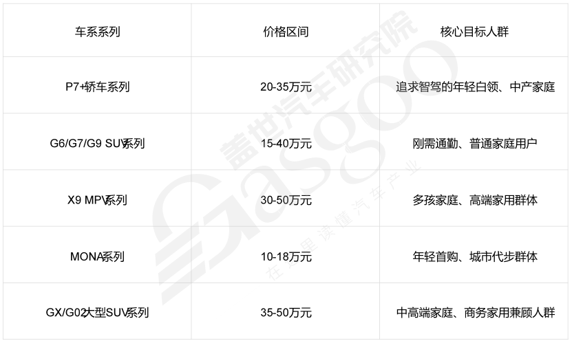 MONA系列:品牌核心走量担当,2024年下半年上市后快速起量,2025年领跑全系,贡献全年近四成销量,夯实10-18万入门市场基本盘。G系列SUV(G6/G7/G9):家用主力车系,2025年销量稳步攀升,贡献超三成总销量,国内外市场双线发力,是品牌销量中坚力量。P7系列:经典轿车标杆,2025年改款后销量回暖,稳固20-35万中高端智能轿车市场,维系品牌科技口碑。X9 MPV系列:高端旗舰车型,2025年销量大幅增长,领跑30-50万智能MPV细分市场,助力品牌高端化突破。