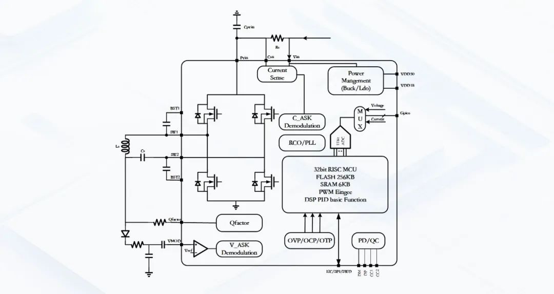 该芯片采用SoC架构设计,集成了智能全桥、多路自适应ASK解码器、超低功耗Q值检测等多个特殊设计的功能模块,并且将全桥功率MOS也集成在片内,使得该芯片在性能和BOM成本上均展现出显著的优势。