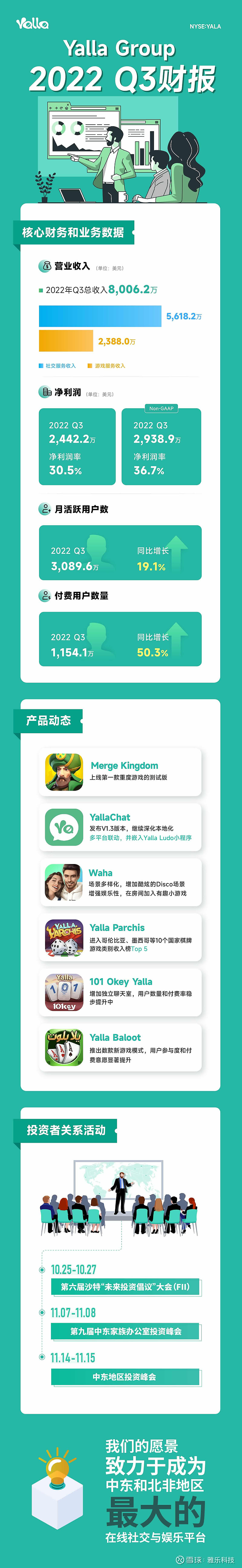 “我们的营收在2022年第三季度再创历史新高,达到8,006.2万美元,在本年度已实现连续三个季度的环比增长,并再一次超出了预期指引的上限”,Yalla Group创始人、董事长兼首席执行官杨涛表示,“这一出色表现得益于我们在完善运营流程、优化用户获取和提升产品货币化能力上的不懈努力。本季度,我们继续通过增强可玩性和娱乐性来全面提升产品矩阵,增强用户粘性,推动集团平均月活跃用户同比增长19.1%至3,089.6万。同时,由于我们专注于提高付费用户转化率,付费用户同比增长50.3%至1,154.1万。”