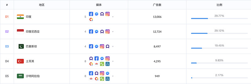 从投放地区来看,过去 180 天,Yalla 广告素材投放 Top5 市场分别是印度、印尼、巴基斯坦、土耳其和沙特阿拉伯,Yalla 似乎希望通过辐射与中东文化相近的印巴市场来实现用户增长与营收增加。