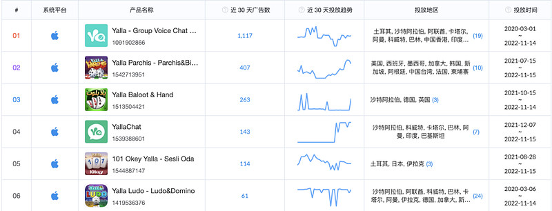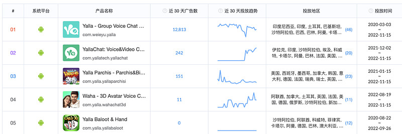 根据 App Growing 出海观察数据,过去 30 天 Yalla Group 旗下的广告投放素材主要集中在 Yalla 产品上,其余几款产品只有零星投放。