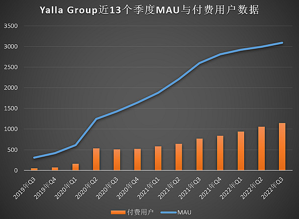 2022 年 Q3 MAU 为 3090 万,同比增长 19.1%,环比增长 3.3%;付费用户为 1150 万,同比增长50.3%,环比增长 8.6%。不过这个增长确实有趣得很,从 Q2-Q3,MAU 增长了 98 万、付费用户却增长了 91 万,显然 Yalla Group 正在加速转化。