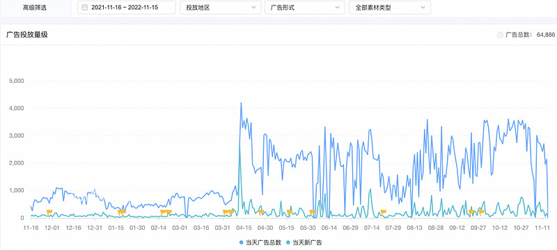 把时间拉长到 365 天来看,2022 年 Yalla 广告投放素材数量远多于 2021 年,不过整体来看 Q3 的投放更加克制,Q4 则更加努力。不过从点点数据统计结果来看,Yalla 在 10 和 11 月的营收似乎并没有随着投放素材数量增加而增加。
