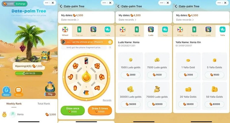 在 Q2 财报解读中,我们有提到 YallaChat 在产品中上线了 Games&Minis 的“小程序功能”,并上线了「Date-palm Tree」和「Hop Up」两个小程序。在近期测评中,笔者发现 Date-palm Tree 不仅能种出果子,甚至有可能种出手机。用户通过完成签到、给好友浇水、使用 YallaChat、分享小程序、添加好友等日常任务,可以获得水滴。当果树获得足够的水滴时则会产出果子,果子可以用于兑换转盘抽奖机会、现金、Yalla Ludo 金币、Yalla 金币。其中在转盘抽奖场景中,用户单次抽奖消耗4500 个果子,可能会抽到 1000-20000 个不等的果子,甚至还有机会获得 iPhone 最新款手机。