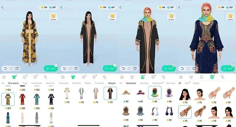 从 Avatar 上看,Waha 支持用户调整服装、饰品和身体三个部分,而且在每个部分都给出了丰富的可用素材选择,也会结合中东用户的特点进行一些本地化供给。如在女性 Avatar 设定时,除了常规的选择,也提供了民族风格印花长裙、头纱、海娜纹身等明显中东特色的素材。除此之外,Waha 还允许用户根据自己的需求和审美创造衣服,供自己使用或出售。