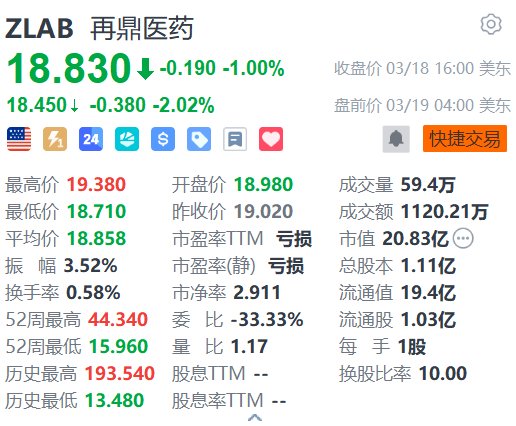 昨日收跌1%的再鼎医药(ZLAB.US)今日美股盘前续跌2.02%,报18.45美元。消息面上,摩根大通分析师Anupam Rama维持再鼎医药“买入”评级,并将目标价从39美元下调至32美元。(格隆汇)