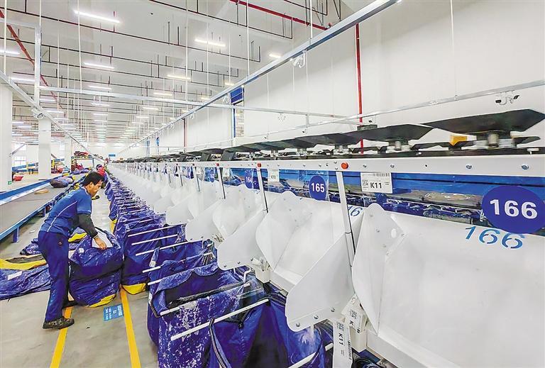 图为高效运转的中通快递北方总部分拣线。(资料片)本报讯(记者 王满凤 通讯员 王峻峰)近日,在位于广阳经开区的中通快递北方总部分拣中心进港库内,两套双层交叉带自动分拣设备高速运转,来自全国各地、大小不一的包裹经扫描后,被精准分拣到相应出货口。